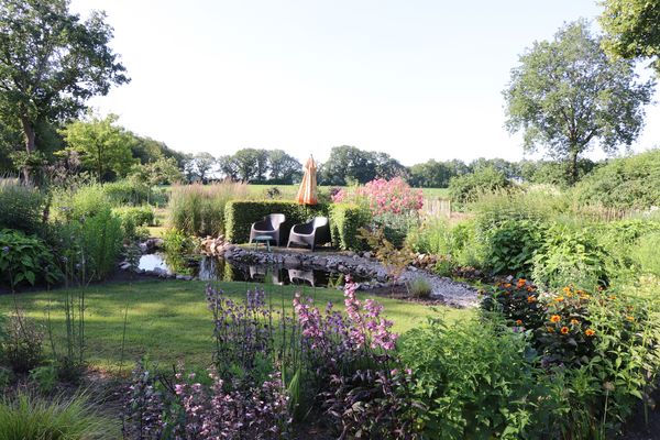 Rondom een prachtig oud boerderijtje ligt een kleurrijke tuin, met prachtige diepe borders, gescheiden door heggen en lage haagjes met steeds een andere sfeer, met een wijds zicht op het prachtige Drentse landschap.